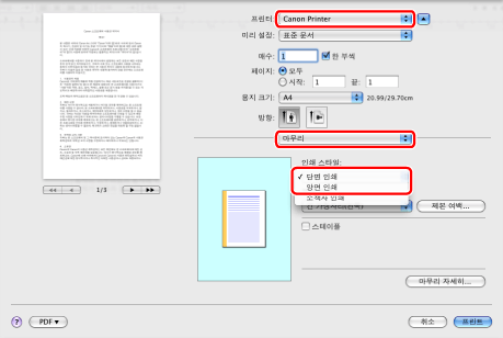 [인쇄 스타일]의 기본 설정은 [양면 인쇄]입니다. 단면 인쇄 설정을 프리셋으로 저장할 수 있습니다. 자세한 내용은 "