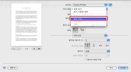 프리셋을 편집하려면 [프린트] 대화상자에서 해당 프리셋을 선택하고 → 프린터 드라이버 설정을 지정한 후 → [미리 설정]에서 [저장]을 선택합니다.
