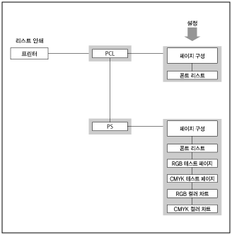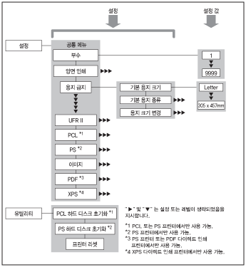 프린터 설정 메뉴에서 일반 기능을 사용할 수 있습니다. 다음은 프린터 설정 메뉴 구조에 대한 간략한 개요입니다.