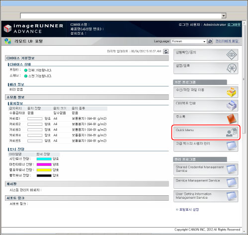 시스템 관리자 또는 SSO-H 시스템 관리자(Administrator)/네트워크 관리자(NetworkAdmin)/기기 관리자(DeviceAdmin)만 퀵 메뉴 페이지를 조작할 수 있습니다. 관리자 종류에 대한 자세한 내용은 "관리자 설정"을 참고하십시오.