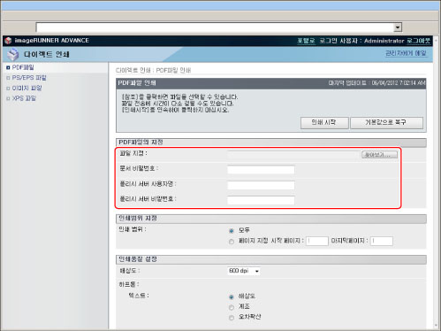 비밀 번호 입력 없이 파일을 인쇄하려 할 경우 <PDL PDF Data Decode Err>라는 메시지가 표시되고 인쇄가 취소됩니다. 인쇄 금지된 PDF 파일을 인쇄하거나 저해상도 인쇄만 허용된 PDF 파일을 고해상도로 인쇄하려면 마스터 비밀번호를 입력하십시오.