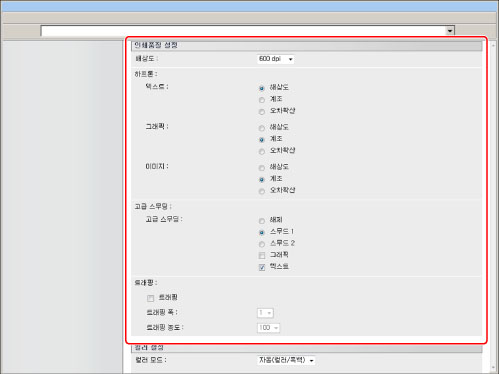'그래픽' 및 '텍스트'에 대한 설정/해제를 선택하여 그래픽 또는 텍스트 데이터에 스무딩 적용 여부를 선택할 수 있습니다.