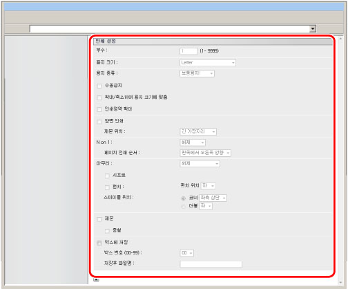 다이렉트 인쇄와 함께 사용할 터치 패널 화면 설정은 '공통 사양 설정', '이미지 설정', 'PDF 설정' 및 'XPS 설정'입니다. '공통 사양 설정', '이미지 설정', 'PDF 설정' 및 'XPS 설정'에 대한 자세한 정보는 "기능 설정: 프린터"를 참고하십시오.