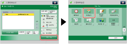 수신인을 지정하고 → [기타 기능]을 누르고 → [미리보기]를 누릅니다.
