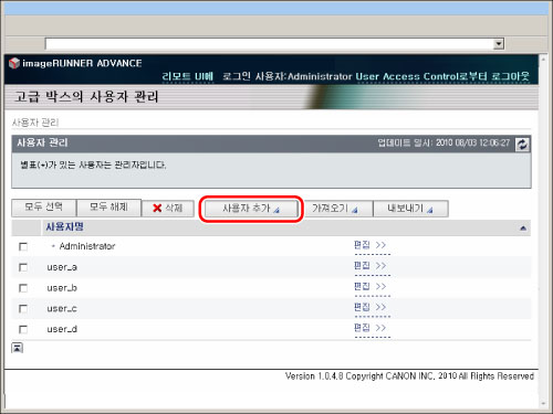 고급 박스 관리자만 [고급 박스의 사용자 관리]의 [사용자 관리] 페이지에서 사용자 정보를 등록/편집할 수 있습니다. 일반 사용자는 자신의 비밀번호만 변경할 수 있습니다.("일반 사용자에 의한 사용자 정보 편집" 참고)