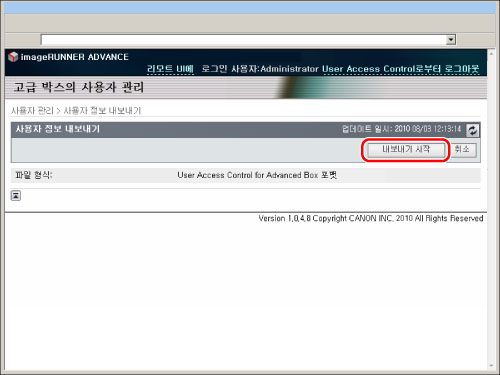 다른 imageRUNNER ADVANCE 시리즈 기기에서 사용하도록 고급 박스에 데이터를 백업할 경우 사용자 정보를 내보내십시오. 다른 기기에서 사용자 정보를 가져오기할 경우 고급 박스에 저장된 데이터는 사용할 수 있습니다. 저장 데이터 백업/복구에 대한 자세한 내용은 "저장된 데이터 백업"을 참고하십시오.