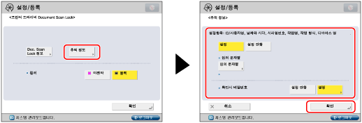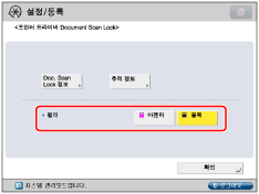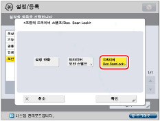프린터 드라이버에서 각 작업에 Document Scan Lock 기능을 사용하려면 [인쇄 기본 설정] 대화 상자에서 [마무리]탭 클릭 → [고급 설정] → [장치의 보안 인쇄 기능]을 [설정]으로 지정합니다. 더 자세한 정보는 프린터 드라이버의 온라인 도움말을 참고하십시오.