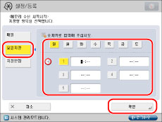 메모리 수신 시작 시각으로 [매일]을 선택하고 메모리 수신 종료 시각으로 [요일지정]을 선택하거나 그 반대로 선택할 수 있습니다.