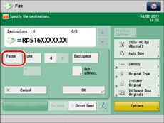 輸入外線接入號碼(以上範例是「R」),按[暫停],再輸入傳真號碼。