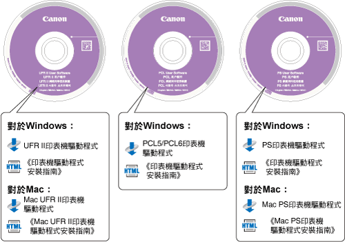 印表機驅動程式從「網路列印使用軟體」光碟安裝。若有多個光碟,請使用以下資訊作為參考並選擇正確的光碟和印表機驅動程式。