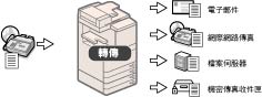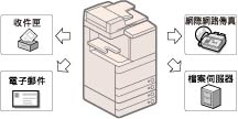 本機器提供多種方便的掃描功能,例如雙面原稿掃描和書本原稿掃描,也可以將分開掃描的文件合併後傳送。也可以根據所掃描原稿的類型設定適當的曝光、色彩模式和掃描尺寸。此外,可以儲存優先掃描設定並可以隨時恢復。