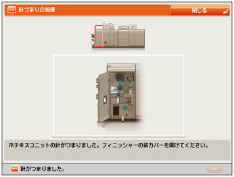針づまりが起きると、タッチパネルディスプレーに、針づまり箇所と処理方法を示す画面が表示されます。画面の指示に従って処理してください。画面は、針づまりが処理されるまで繰り返し表示されます。[閉じる]を押すと、針づまりをすぐに処理しなくてもモードの設定、原稿の読み込みなどの操作を続けることができます。