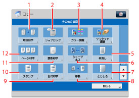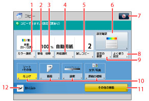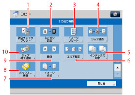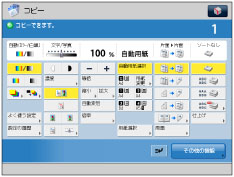 を押して画面を切り替えることができます。この画面にはコピーで利用できる応用機能が表示されます。