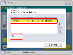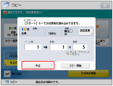 コピー中、または待機中に表示される画面の[中止]を押すと、コピー中のジョブや一番最後に原稿を読み込んだ待機中ジョブを中止できます。