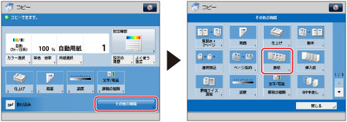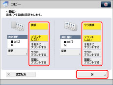 表紙、裏表紙で[オモテにプリントする]、[ウラにプリントする]または[両面にプリントする]を選択すると、手順3で選択した用紙カセットから用紙が給紙され、表紙、裏表紙として用紙のオモテ、ウラまたは両面にコピーされます。