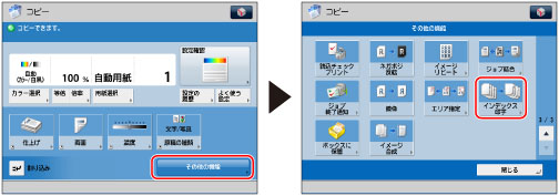 ![]() [残留インデックス紙の強制排出]を「ON」に設定している場合は、1部ごとに余ったインデックス紙を強制的に排紙します。例)[インデックス数]を「5」に設定していて、1部に必要なインデックス紙が「7」枚の場合は、インデックスが「5」ついたインデックス紙を「2」セット給紙します。インデックス紙は全部で「10」枚になりますが、必要なインデックス紙は「7」枚なので、残った「3」枚のインデックス紙が排紙されます。(→残留インデックス紙を強制排出する)