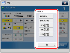 コピー(クイック)画面では、設定項目がポップアップ表示画面で表示されることがあります。ポップアップ表示画面を閉じるときは、[OK]を押します。