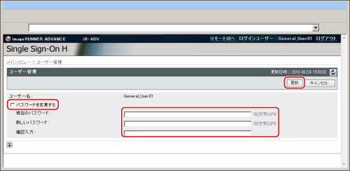 ローカルデバイス認証の一般ユーザーは、自分自身のパスワードを変更できます。これによって、ユーザーの個人情報のセキュリティーを高められます。システムアドミニストレーター(Administrator)は、一般ユーザーにパスワードの変更ができることをお知らせください。