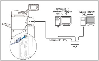 1000Base-T、100Base-TX、10Base-T対応の機器が混在しているときは、スイッチングハブなど、1000Base-T、100Base-TX、10Base-Tのすべてに対応した機器が必要です。詳しくは、お買い求めの販売店、または担当サービスへお問い合わせください。