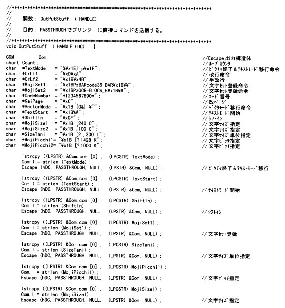 LIPSモードで、「A1234567890A」のNW-7のバーコードとOCR_B文字でコード番号を印刷する場合。(メインプログラムは「VC++用共通サンプルメインプログラム」を参照)
