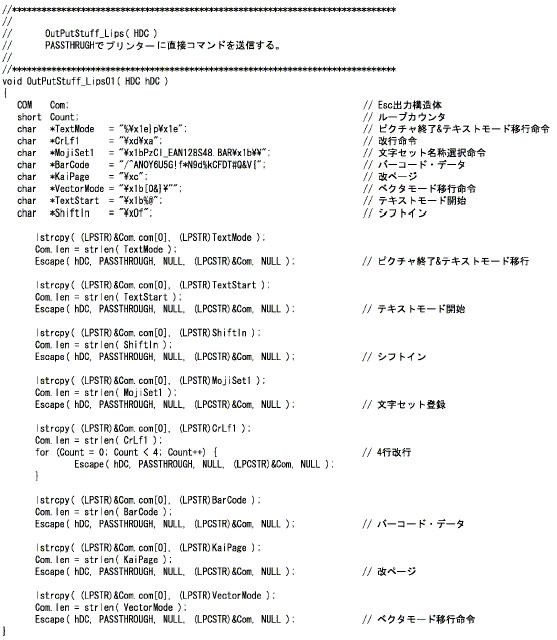 LIPSモードでスケーラブルフォントを使用し、EAN-128のバーコードを印刷する場合。(メインプログラムは「VC++用共通サンプルメインプログラム」を参照)
