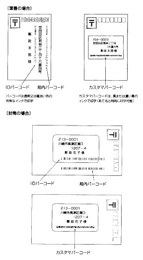 郵便物に印字するバーコードには、局内バーコード、IDバーコード、カスタマバーコードの3種類があります。局内バーコードとIDバーコードは郵便局で印字するバーコードです。
