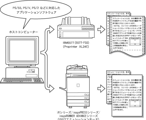iRシリーズ/imagePRESSシリーズ/imageRUNNER ADVANCEシリーズの動作モードがI5577エミュレーションモードに切り替わることによって、IBM5577プリンターを使って印字したときと同等の印字を行うことができます。