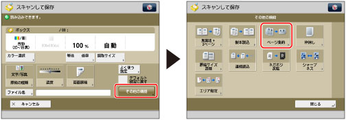 複数の原稿や両面原稿を、1枚の用紙に並べて読み込みます。並べる原稿の数は2枚、4枚または8枚から選択します。両面プリントやレイアウトの順番を設定することもできます。