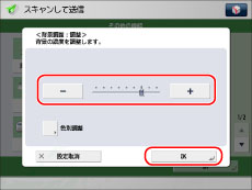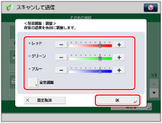 [色別調整]の調整画面で[全色調整]を押すと、全体の濃度の調整画面に戻ります。
