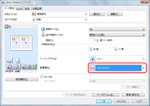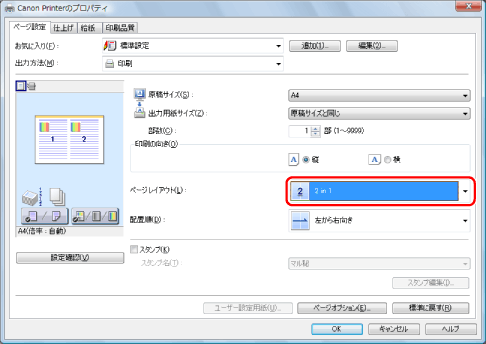 [ページレイアウト]で項目が選択できない場合は、[コントロールパネル]からプリンターのプロパティ画面を表示して[デバイスの設定]タブをクリックしたあと、[内部スプール処理]から[自動]または[必ずホスト側で処理を行う]を選択してください。プリンターのプロパティ画面の表示方法については、「プリンターのオプション設定をする」を参照してください。