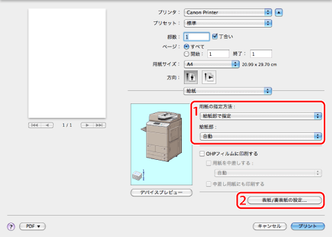 特定の用紙に印刷したい場合、その用紙がセットされている給紙部、またはその用紙種類を指定します。