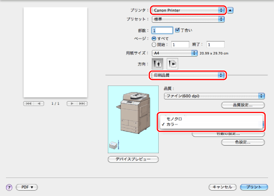 お使いのプリンター→[印刷品質]→[カラーモード]から[モノクロ]または[カラー]を選択
