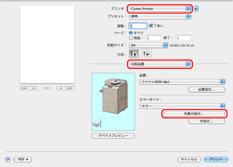 お使いのプリンター→[印刷品質]を選択→[色数の設定]をクリック