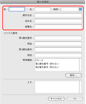 お使いの機種によっては、[特殊機能]の[設定]をクリックして、Fコード機能(相手先のメモリーボックスに暗証番号を付加して文書を送信する機能)の情報を設定できます。