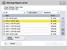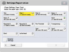 You can register paper types if paper types for the loaded paper are not displayed on the detailed setting list. For instructions on registering paper types, see "Registering/Editing Custom Paper Types."