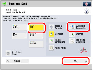 Select [PDF] → [OCR (Text Searchable)] → press [OK].