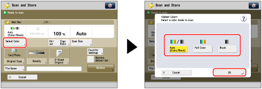 If you select the Auto (Color/Black) mode, the machine automatically recognizes whether the original is in colour or black-and-white. Colour originals are scanned in the Full Color mode, while black-and-white originals are scanned in the Grayscale mode.