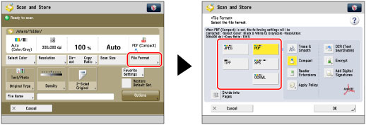 You can select additional settings if you store the scanned file in the PDF, XPS, or OOXML format. Refer to the following for instructions on setting each type of PDF, XPS, or OOXML: