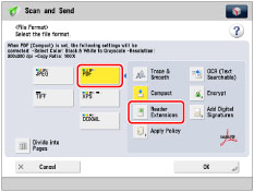 Press [Scan and Send] → specify the destination → press the file format button.