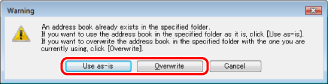 If an address book already exists in the folder selected in step 3, the following message box will be displayed. If you want to use the existing address book, click [Use as-is], and if you want to use the address book of the fax driver, click [Overwrite].