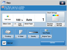 If you set <Allow Black Copy/Print Jobs> to 'On', [Black Copy/Print] appears on the screen for entering the Department ID and PIN and the screen for inserting a control card.