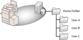 When setting up the home folder on the Windows (SMB) shared folder, you do not have to prepare user folders. If a folder named with a login user name is not prepared under the home folder, the folder is created automatically.