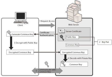 When the user accesses the machine from their computer, the server certificate for SSL and the public key for the server are requested.
