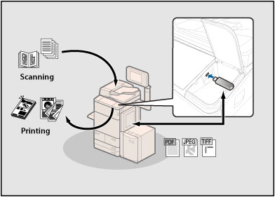 Memory media is a storage location that can be used by connecting USB memory to the USB port of the machine. You can scan a document with this machine and store it in memory media in various file formats that can be used on your computer. You can also print files stored in memory media on this machine at any time with your desired print settings.