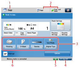 The progress of jobs and copy operations, and the status of devices and consumables are displayed here. Also, depending on the login service you are using, the Department ID or user name can be displayed.