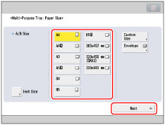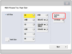 (Clear) → enter the correct values.To select a registered paper size stored in a size button ([S1] to [S5]), you must store the irregular paper size in the size button beforehand. For instructions on storing irregular paper sizes, see "Registering/Editing/Deleting Custom Paper Sizes."