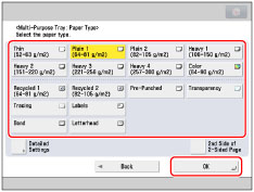 To print on the backside of preprinted paper, load the paper into the multi-purpose tray, and press [2nd Side of 2-Sided Page] on the paper selection screen that appears.