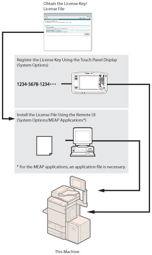 You can install system options/MEAP applications in the machine using the Register/Update Software function.