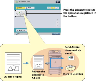 For example, you can scan an A3 original, reduce it to A4 size, and send the file via e-mail, while also storing a backup of the file in a Mail Box, all by pressing one flow button.