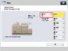 If [Paper Drawer Auto Selection On/Off] is set to 'Off' for a particular paper source, you cannot make copies on paper loaded in that paper source in the Automatic Paper Selection mode. (See "Enabling Paper Drawer Auto Selection.") Also, even if [Paper Drawer Auto Selection On/Off] is set to 'On' for a paper source, depending on the paper type, automatic paper selection may not be performed. To use paper loaded in a paper drawer for which automatic paper selection cannot be performed, manually specify the paper drawer and perform copying.